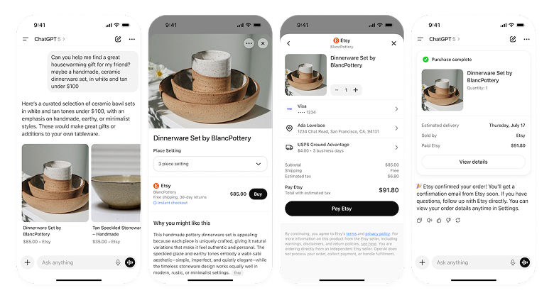 From recommendation to checkout: an AI assistant comparing products, selecting options, and completing a transaction within a single conversational flow. Source: OpenAI