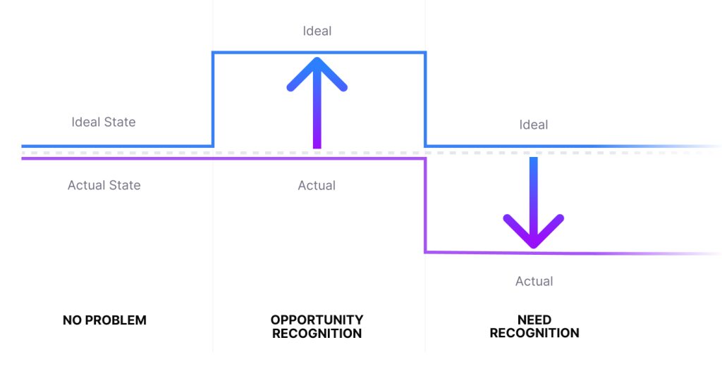 This diagram shines some light on the marketing theory behind intent. We will delve deeper into this below but it shows how conversion intent is driven by the gap between a visitor’s actual state and their ideal state. When there is no gap, there is no motivation to act; when the gap is framed as an opportunity, persuasion effort is high and intent is weak. When the gap is experienced as a need, urgency increases, friction drops, and conversion becomes significantly easier.